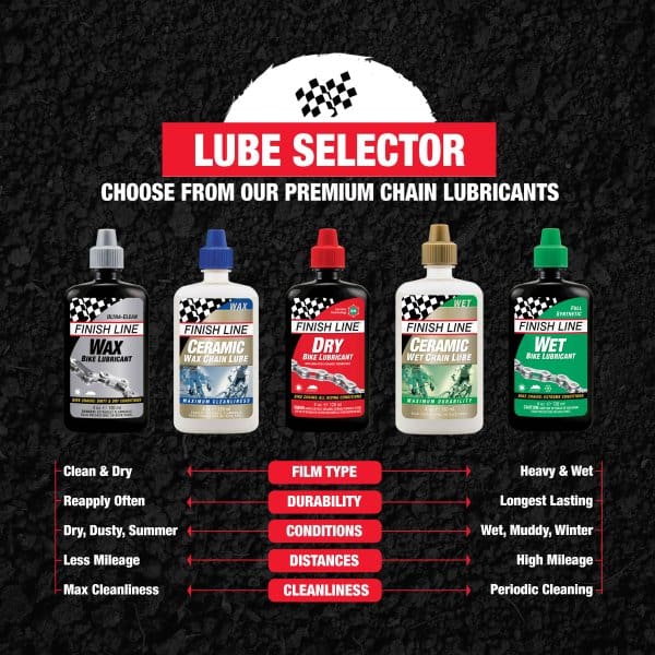 Finish Line Wet Lube được pha chế từ dầu tổng hợp có độ nhớt cao, polymer đặc biệt, phụ gia chống mài mòn và chất giảm ma sát. Sự kết hợp này tạo nên loại dầu mạnh nhất, bền lâu nhất và chống nước tốt nhất của hãng.